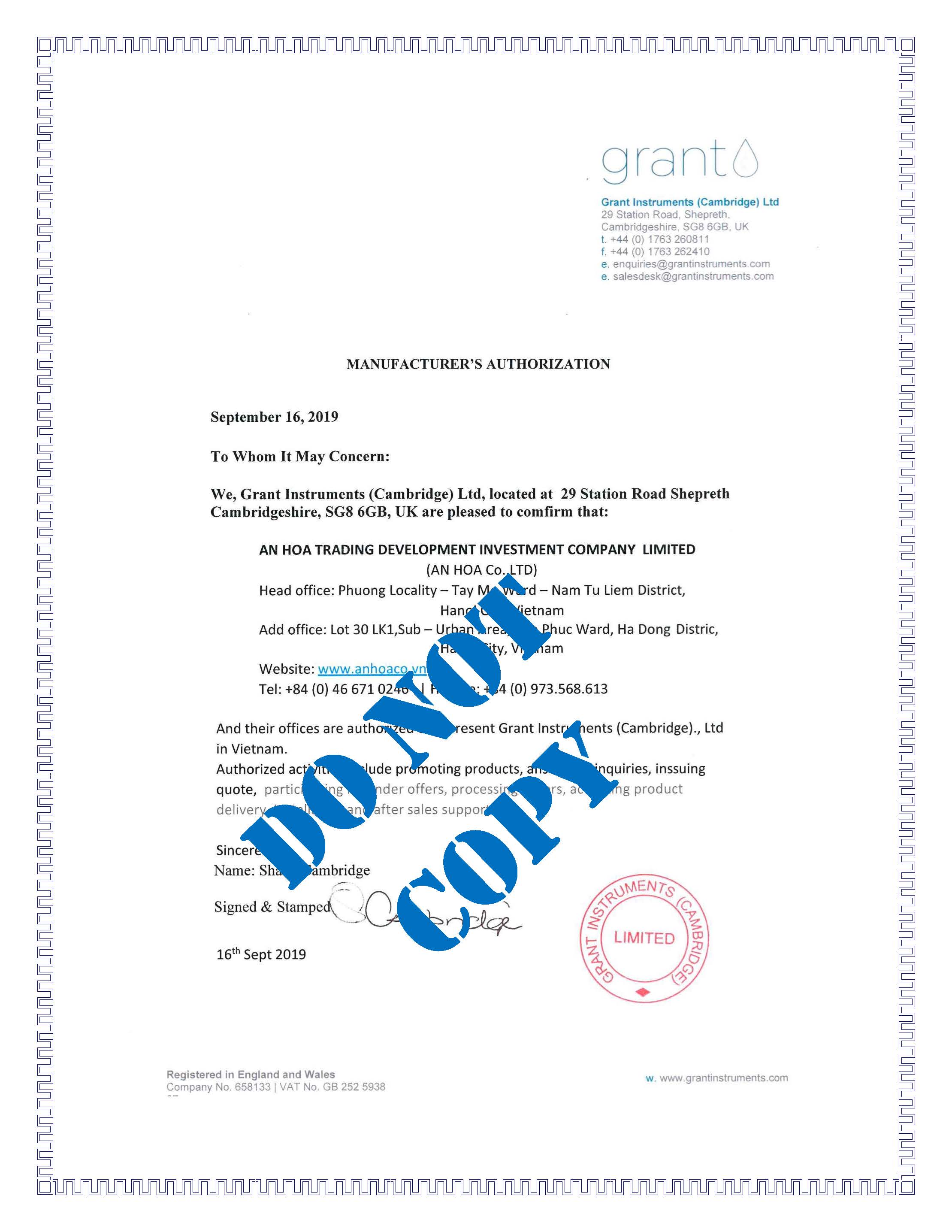 Để đánh dấu bước phát triển tiếp theo không ngừng về sự hiện diện của Grant Instrument, ngày 16 tháng 10 năm 2019 đã chính thức như một mốc phát triển đáng nhớ của Grant trong việc lựa chọn công ty An Hòa chính thức là đại diện cho thương hiệu Grant phát triển tại thị trường Việt Nam cũng như một số thị trường khác như Lào, Campuchia.