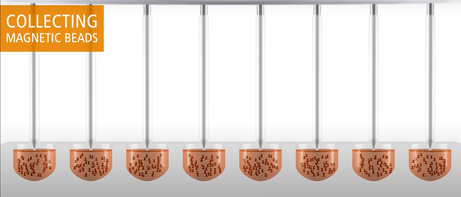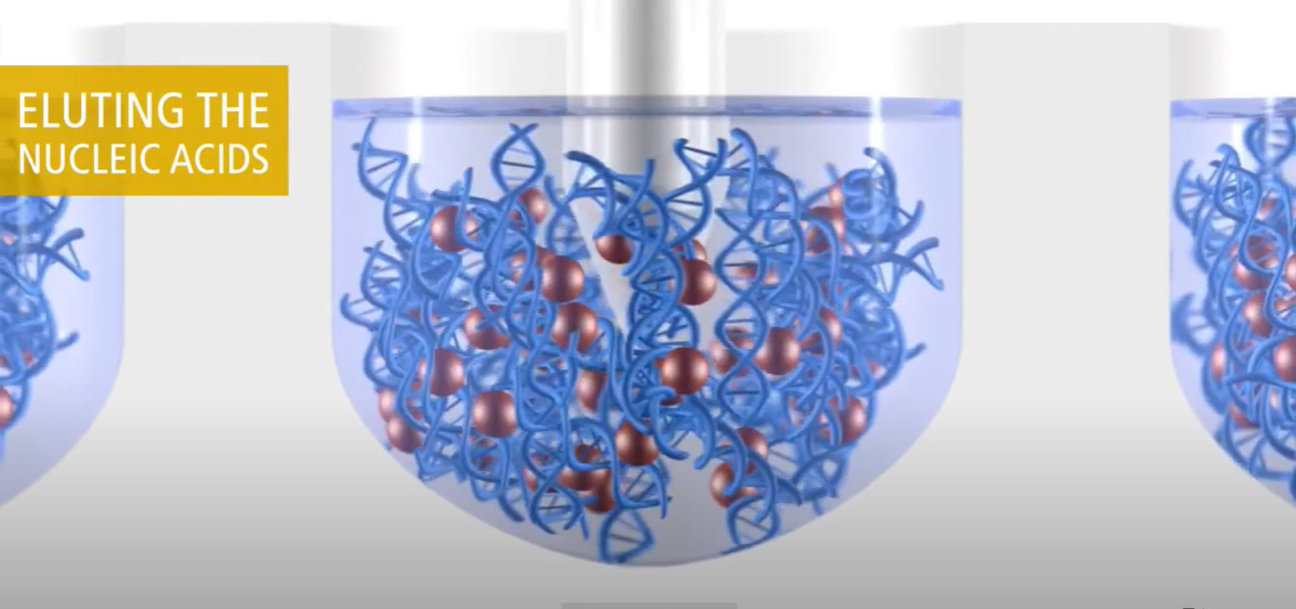 - Thu các hạt từ bằng các đầu ống, sau đó đặt vào các mẫu DNA- Axit nucleic cần thực hiện. Qúa trình đặt vào các ống đựng mẫu, các hạt từ sẽ được phân tách rồi quấy trộn đều để kẹp chặt mẫu DNA bằng lực hút từ trường như hình dưới
