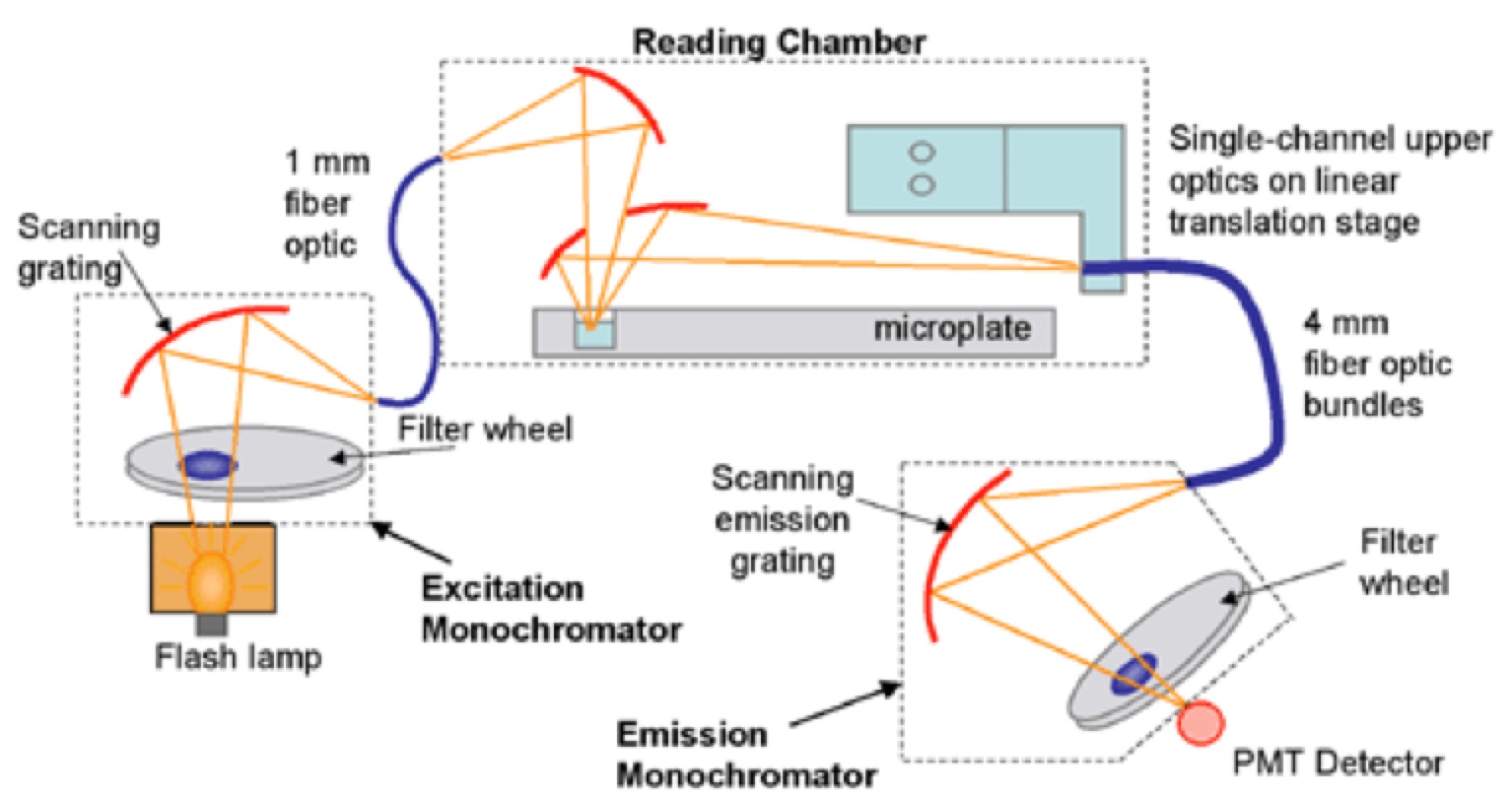 Tùy thuộc vào bản chất của sự thay đổi tín hiệu quang học trong quá trình phản ứng và do đó vào chế độ phát hiện, các mẫu có thể cần được kích thích bằng ánh sáng ở các bước sóng cụ thể. Ánh sáng này thường được cung cấp bởi đèn flash xenon dải rộng. Để cho phép kích thích mẫu chỉ bằng các bước sóng cụ thể, ánh sáng do đèn tạo ra được chọn bằng bộ lọc kích thích hoặc bộ đơn sắc cụ thể. Để tăng độ nhạy và độ đặc hiệu, các bộ lọc hoặc bộ đơn sắc đều được sử dụng như nhau ở phía phát xạ / phát hiện. Chúng thường được đặt giữa mẫu và máy dò.